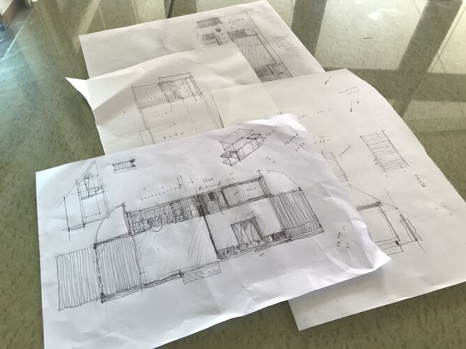 Sketches informally present ideas & discussion points during the design stage. Here floor plan, room, fittings & furniture layouts, floor finishes, joinery placement, sizes, roof form and structure are discussed. Typically there will be many sketches worked up as ideas and facts are presented and tested and the design developed to a definitive stage.
