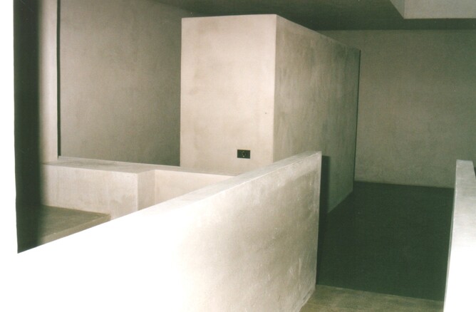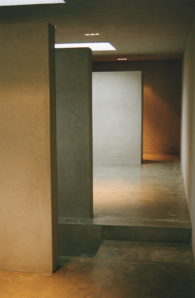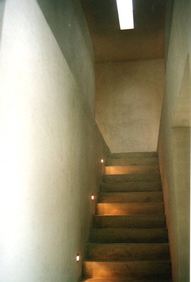 The Internal concrete stair was one structure poured in situ. The natural concrete textural finish was accented with industrial styled square stainless steel lighting units. The result of this approach for the interior fit out was creation of a gallery-esque aesthetic. Living areas were furnished with antique furniture by the original owner.