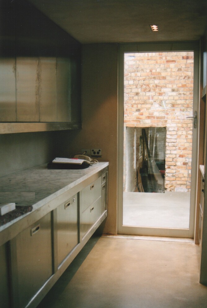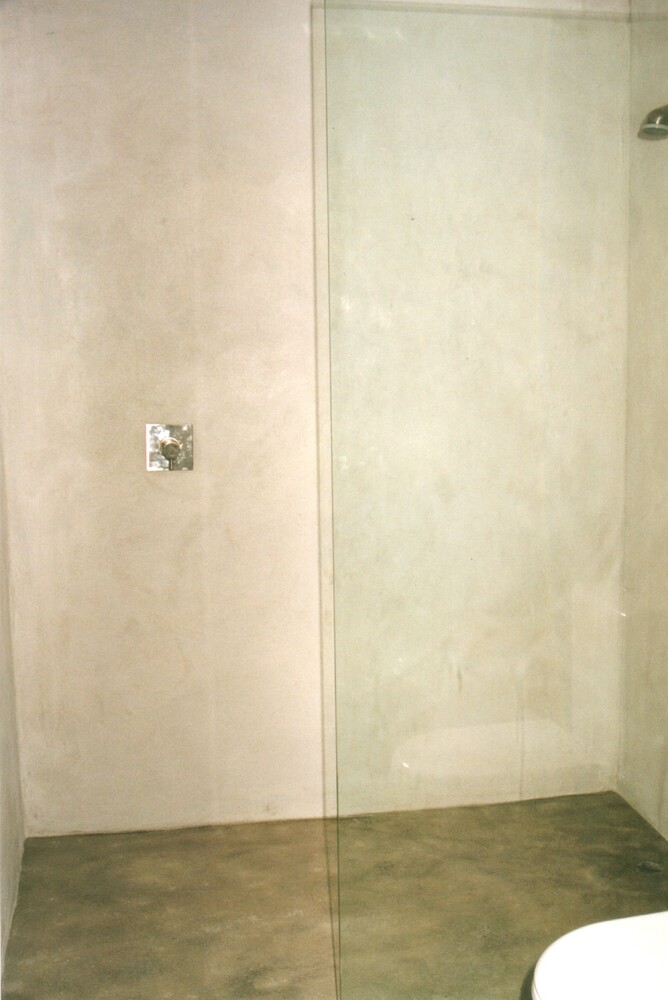 Fixures and fittings also an industrial aesthetic, stainless steel lighting and plumbing units which were flush mounted directly into concrete forms.